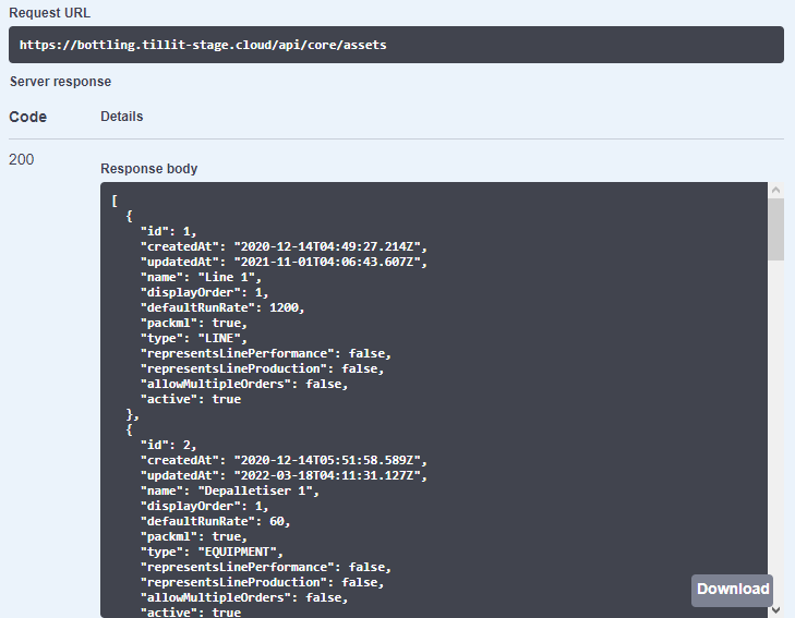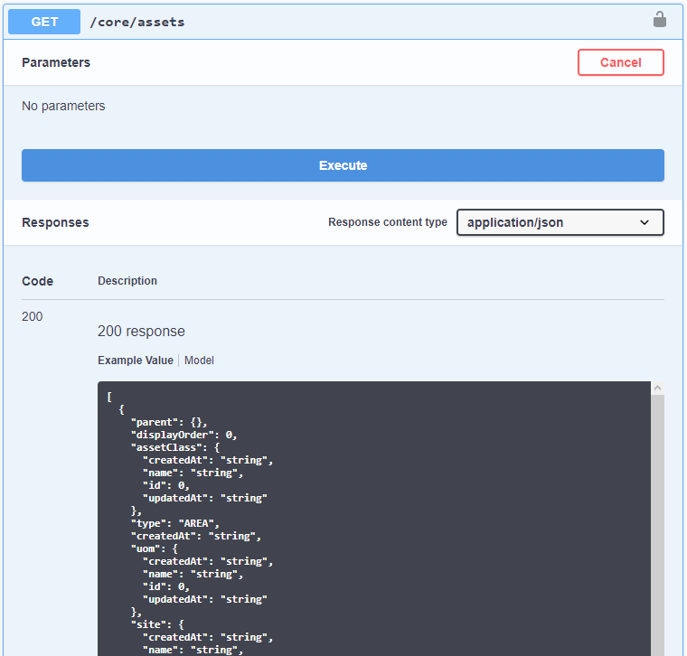 TilliT uses a REST API. What this means is that each endpoint will have a related object or entity that will be manipulated by one of GET, POST, PUT or DELETE. The Swagger UI shows each of entity and the relevant method that can be executed for each of its endpoints. Clicking on one of the endpoints, in this case GET:/core/assets/ will show the response you can expect after the query is executed.