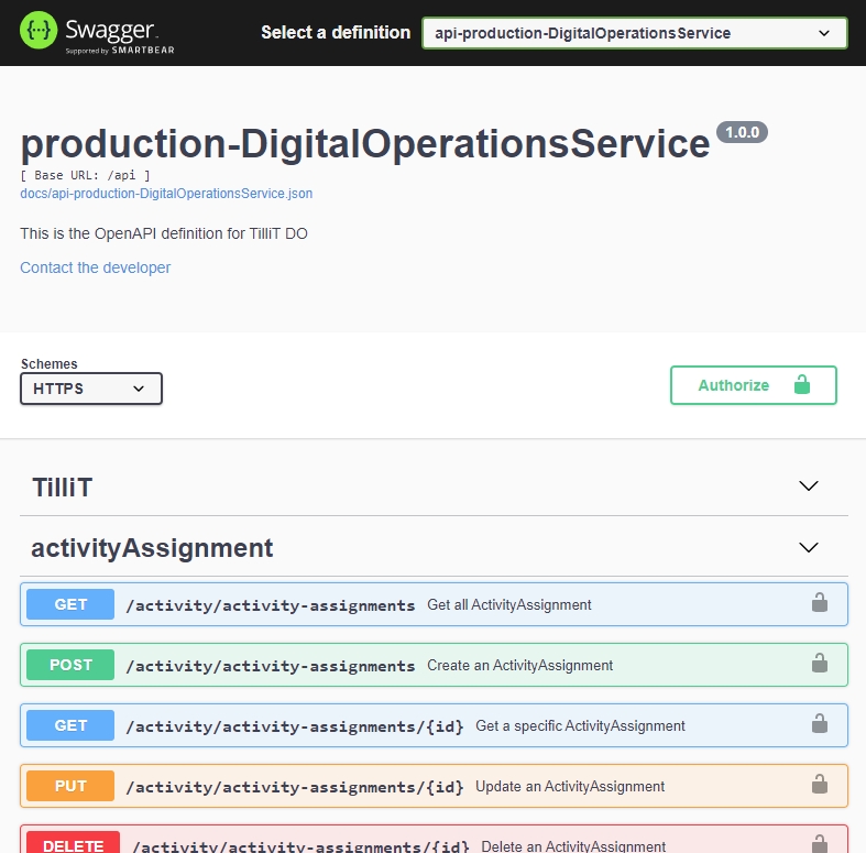 This swagger file has two definitions, one for our Scheduler API and TilliT API. Switch via the top right drop down to the api-production-DigitalOperationsService to get the relevant endpoints you need.