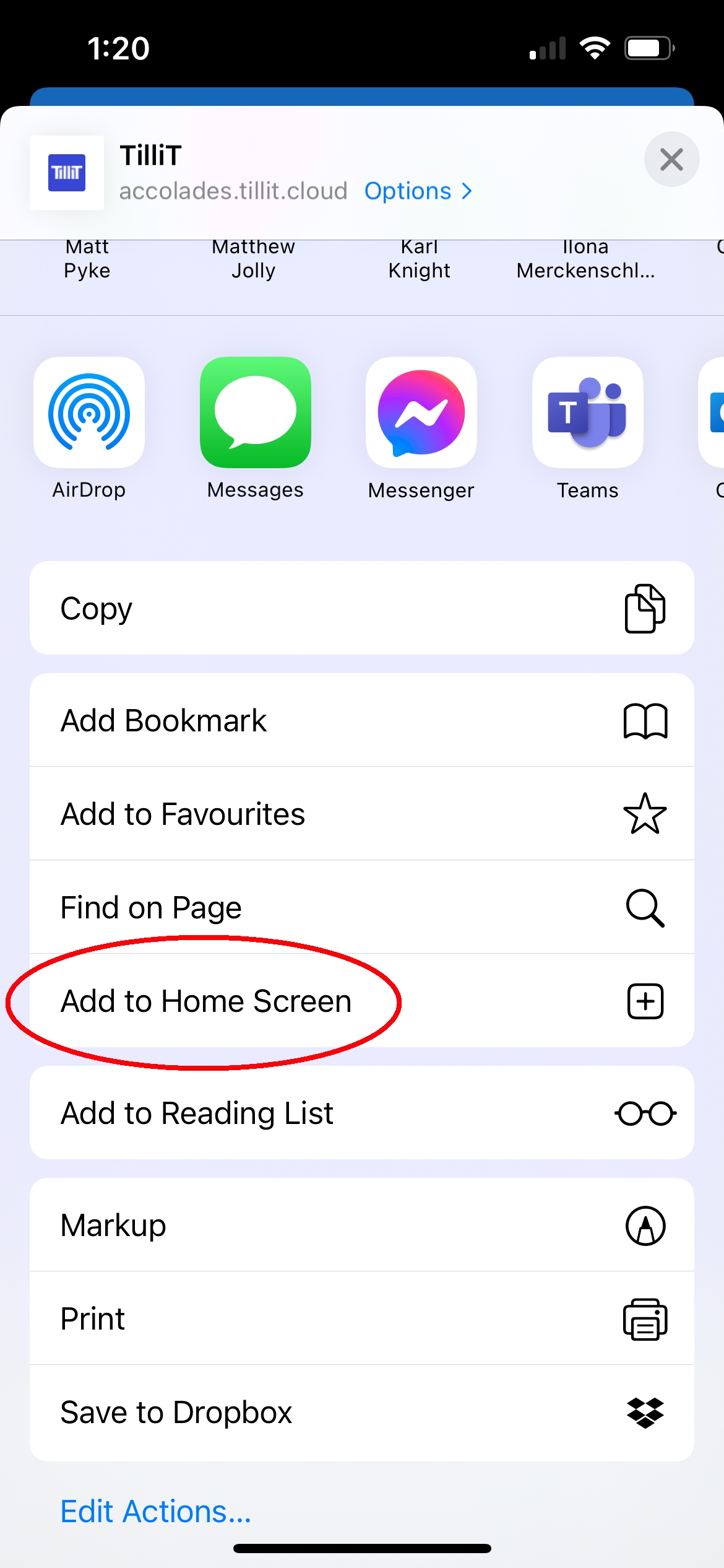 Scroll down to the list of actions and tap Add to Home Screen*