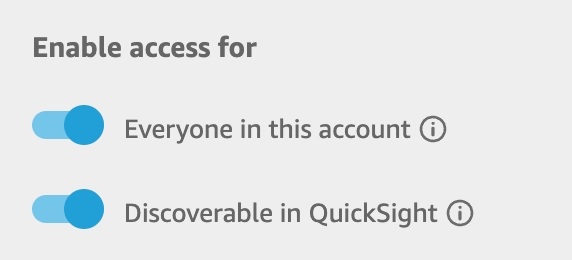 In the bottom left hand corner, toggle on Everyone in this account, which will make the second toggle appear. Then toggle on Discoverable in QuickSight. This will grant all Advanced Analytics users Viewer permissions to the dashboard.