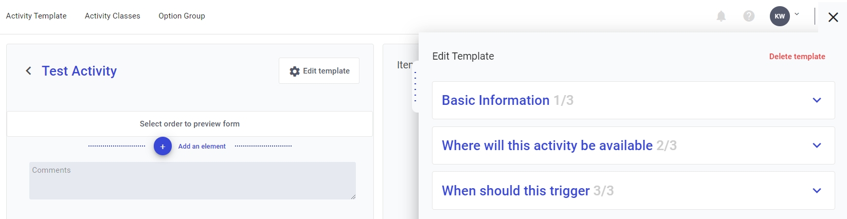If you need to make any changes during the activity setup at any point, or you need to delete the template entire, you do this via the Edit template button. This will bring the template settings up on the right: