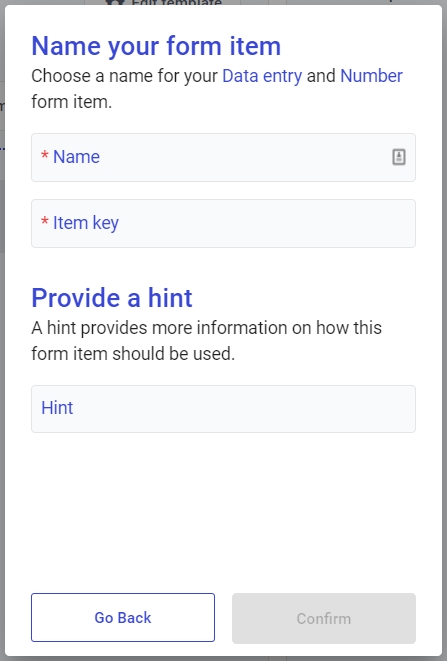 You'll need to give the item a Name and an Item Key. The Item Key is generated from the Name, but can be changed. The Item Key must not contain spaces or special characters. The Hint (optional) is a text field for you to provide extra context (e.g. what control to use on the machine):