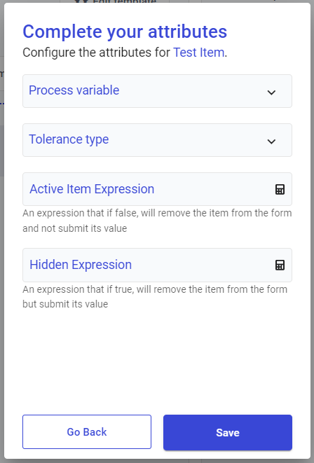 Finally, you'll be asked to add any additional attributes to the item (optional), such as a Process Variable or Active Item Expression (details of each of these are available in this Help Portal). Once you've added these, click Save.