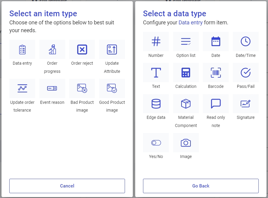Next, click on Add an element. You will be asked to select an item type, followed by a data type: