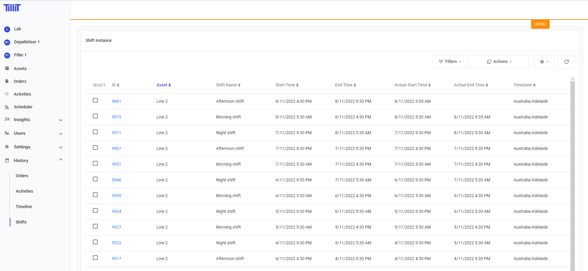 Upon creating a shift, see that a Shift started event has occured on the asset. If a previous shift was running, then a Shift ended event also appears.
