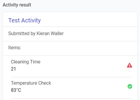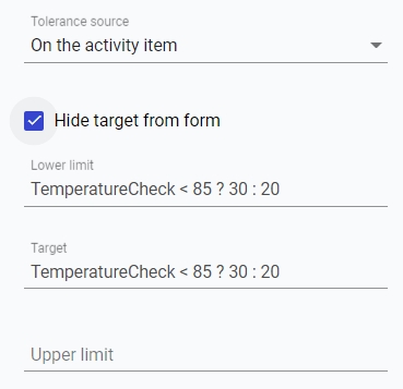 In the example, having a temperature below 85°C means that cleaning time should take 30 minutes (10 minutes longer than standard). If they enter that they took less than 30 minutes, the activity will now fail.