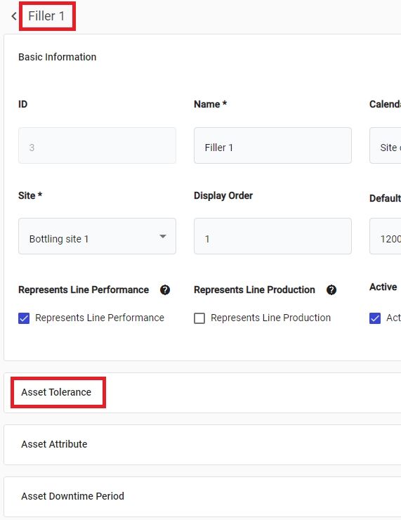 Next, click on the Asset you want to apply a tolerance. In this case, Filler 1. This will open Filler 1's configuration. We need the Asset Tolerance tab:
