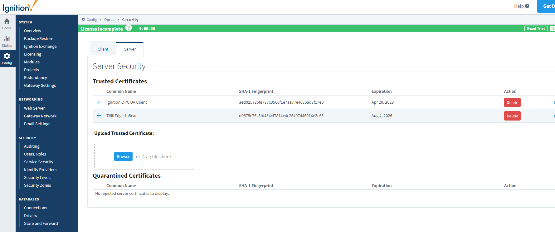On your OPC-UA server, locate the certificate in the quarantined zone (e.g., in Ignition: