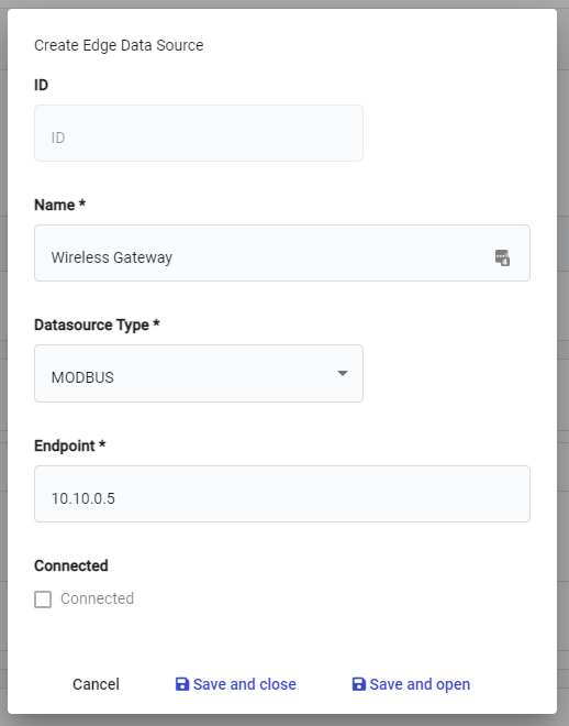 2. Create a new Edge Data Source, replace the endpoint with the IP of the wireless gateway that you have configured.(Remember the default is 10.10.0.5 when directly connected)