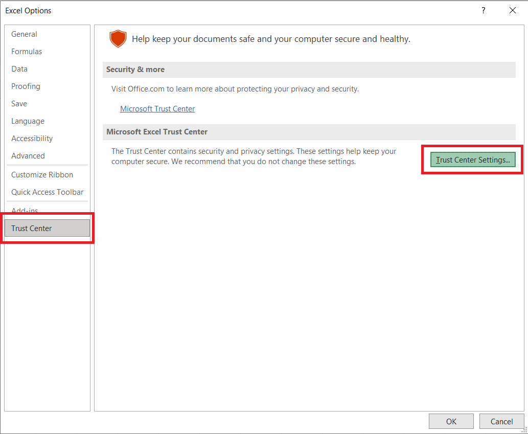 Go to Trust Center in the side bar, then click the Trust Center Settings button.