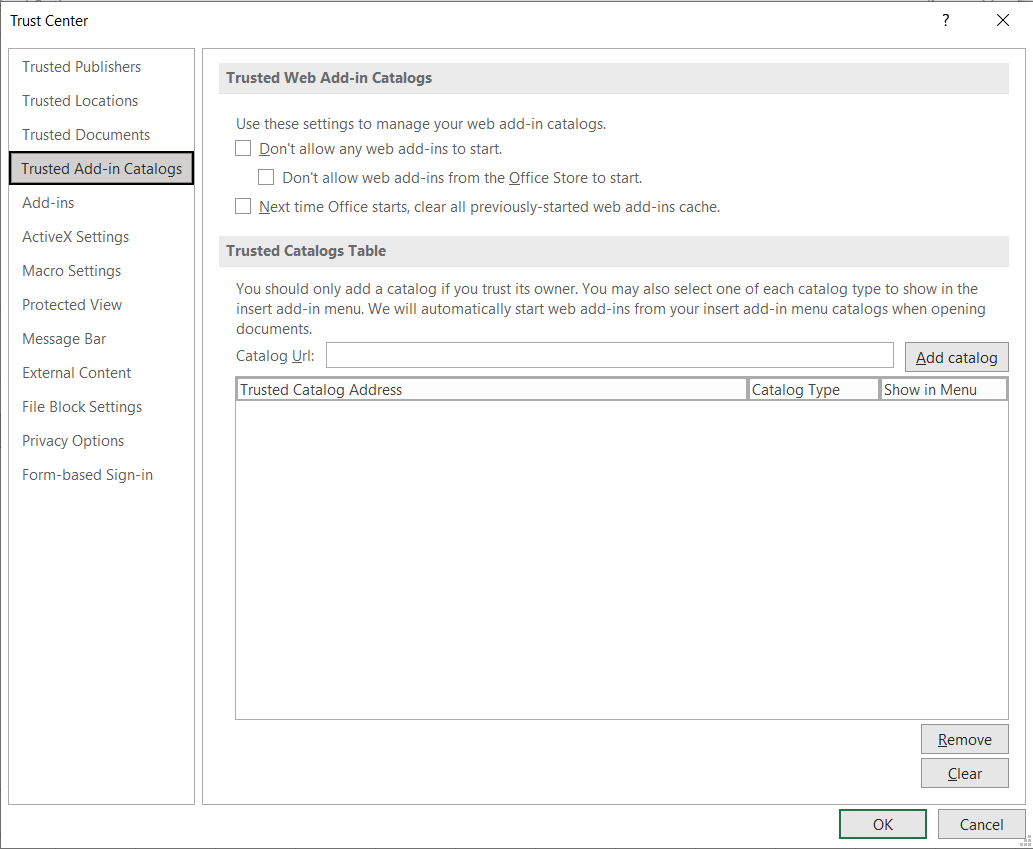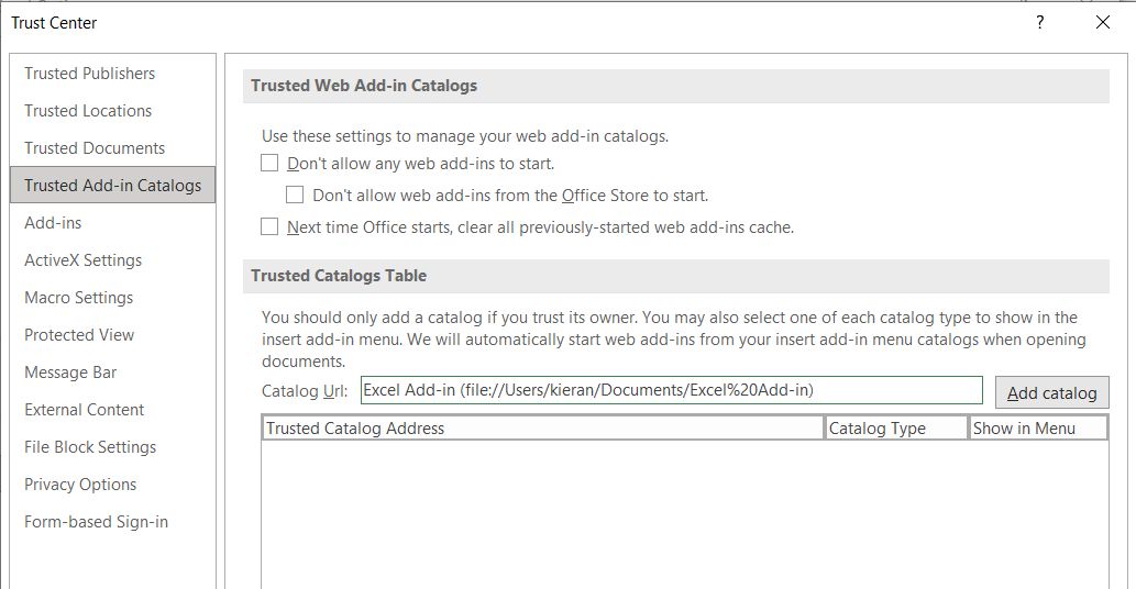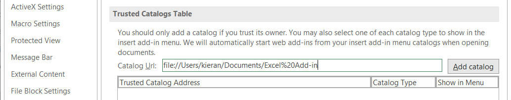 Once you've added the location to the Trust Center, you can insert the add-in.