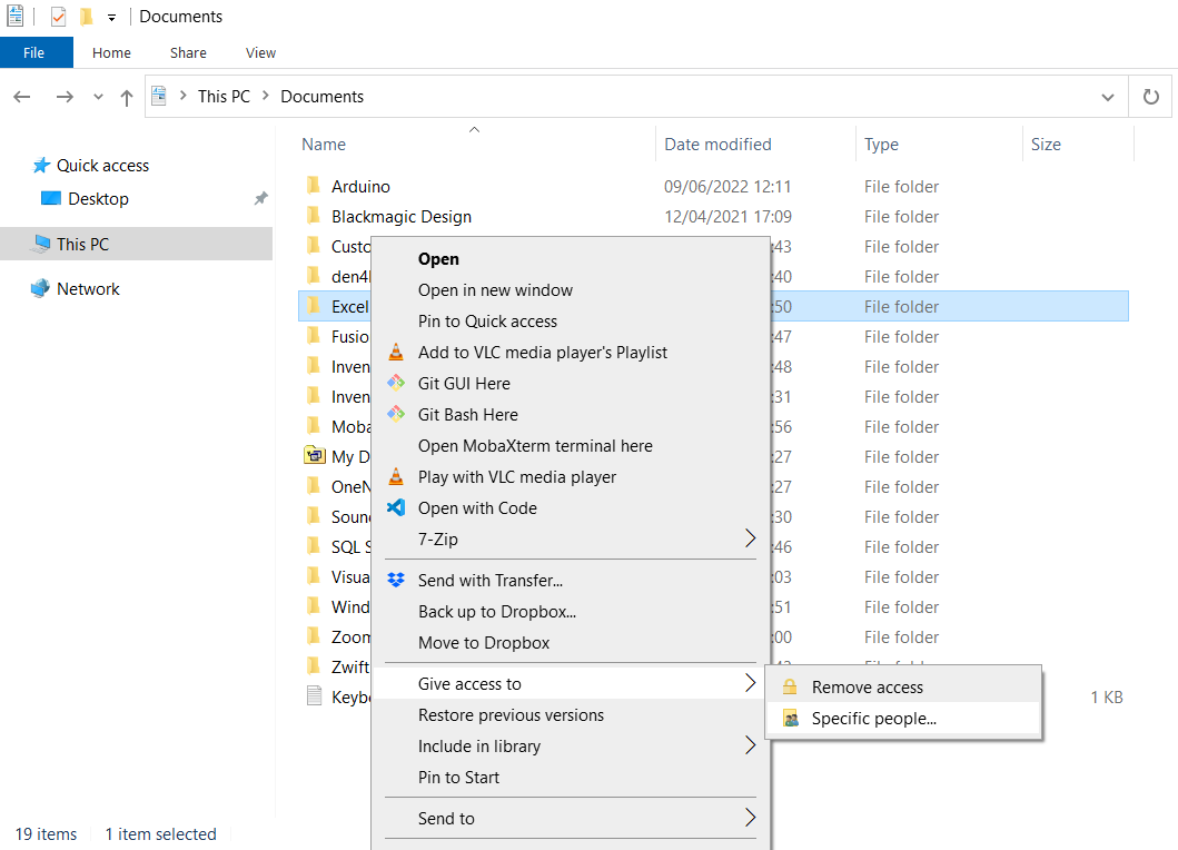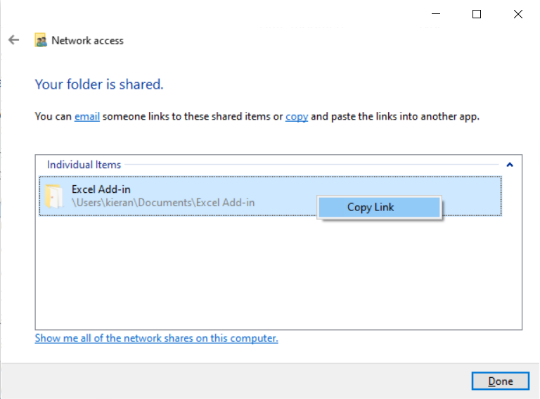 Here, we need the shared path for the Excel Add-in. Go to Windows Explorer and find the folder where you saved the Excel Add-in. Right-click the folder (not the file within) and select Give access to > Specific people.