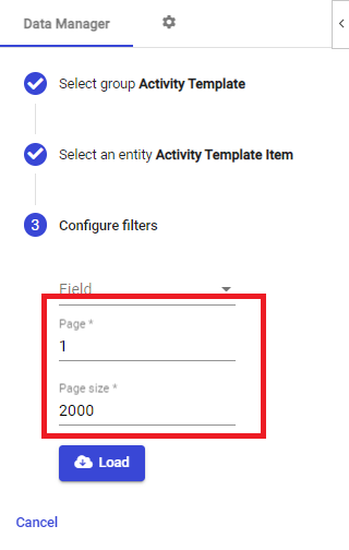 Once you've selected an entity, you will be asked to define the Page size (how many results should be given per page/excel sheet) and which Page number you wish to load. For example, if there are 20,000 entries in TilliT, setting the Page size to 2,000 will divide the data into 10 pages. Only one (1) page can be loaded at a time, so you would need to choose which page using any number between 1-10.This helps when dealing with a large number of entries.