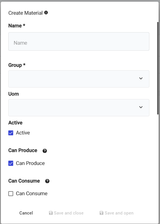 A material group can be a category of raw materials, or a category of finished products. For example: "Ingredients" for any material that acts as an ingredient for a product, or "Finished Goods" for finished products.