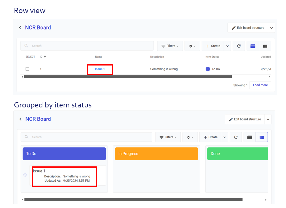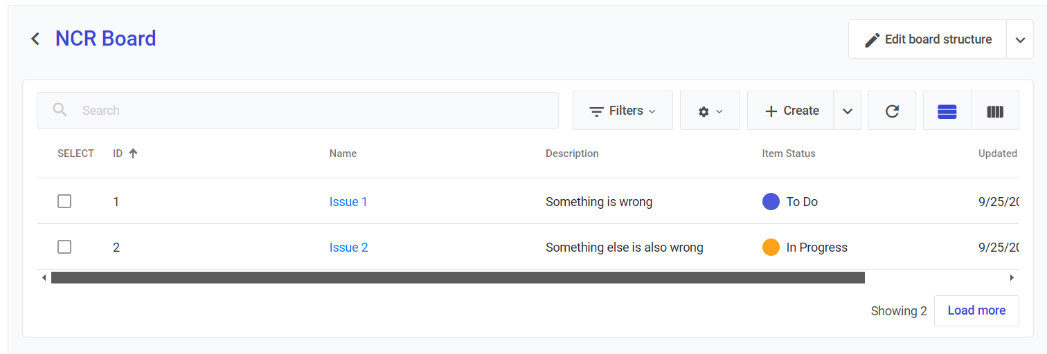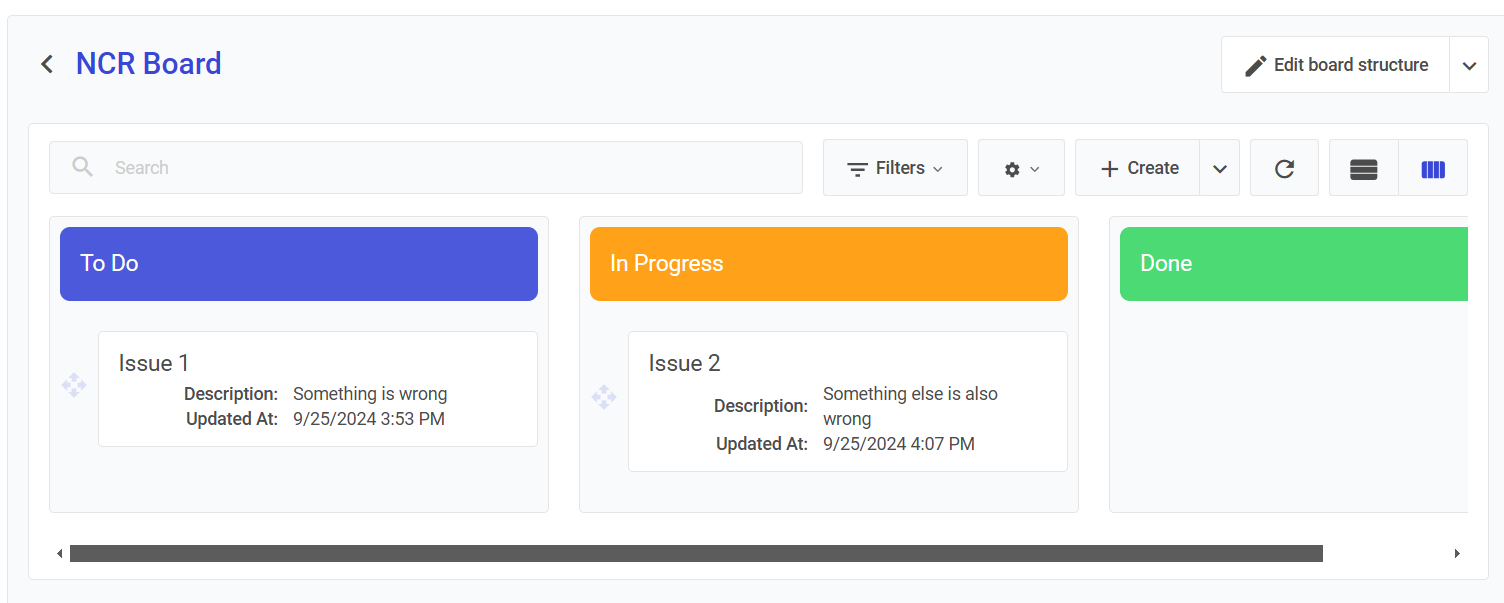 4. The new NCR entry appears on the board, allowing the team to address the issue and track its resolution through the workflow.