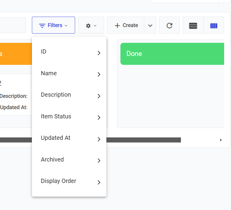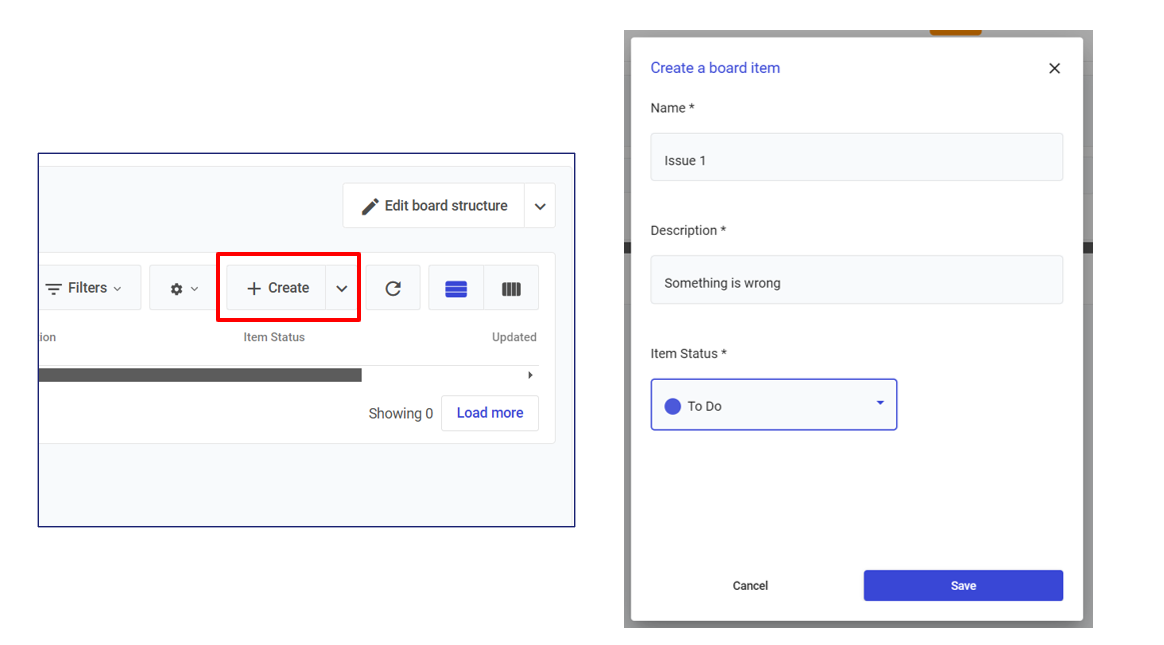 Once the board structure is ready, you can easily add items to it. Click on **Create** on the top right corner then fill out the modal. For example: