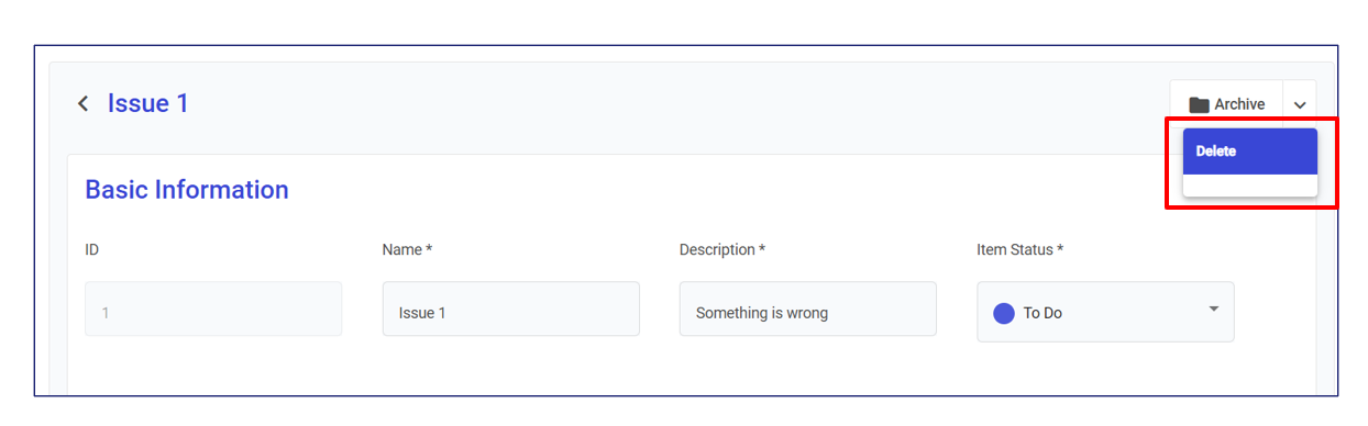 If you are in the item's basic information panel, click on the **arrow next to Archive**, and choose **Delete in the dropdown** to delete the item.