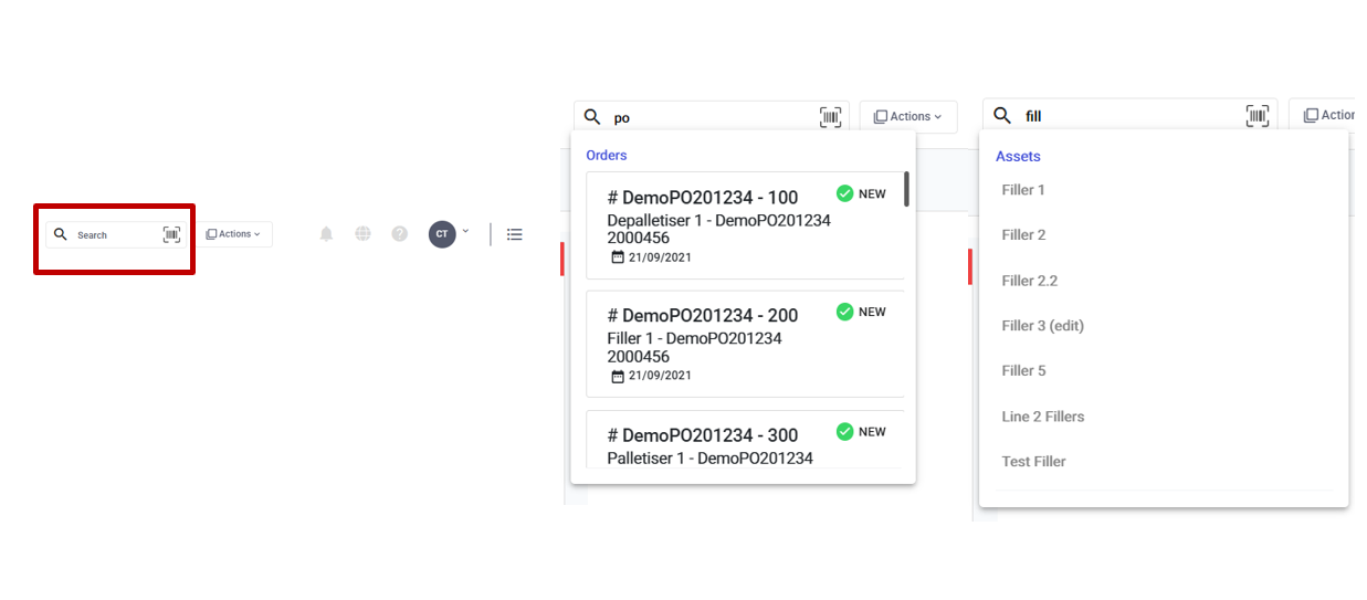The Quick search on the top right of the UI allows you to quickly search for any running orders or assets and will navigate you to them when clicked.