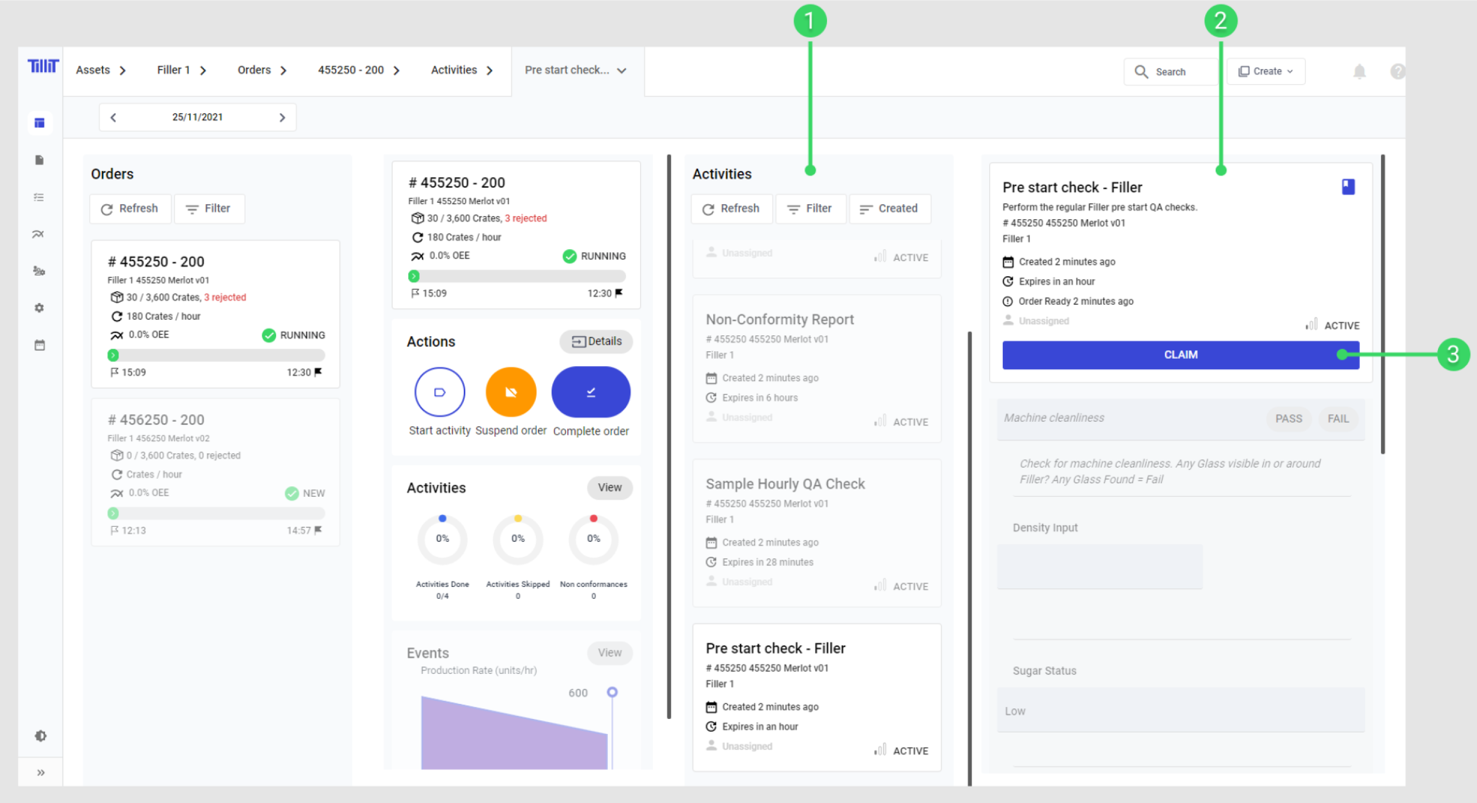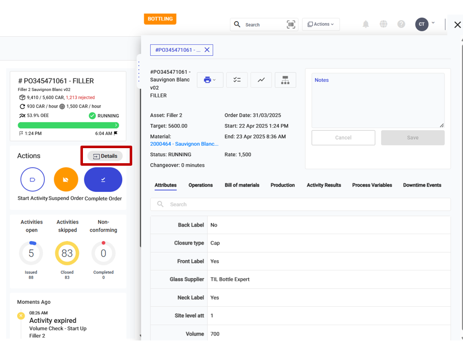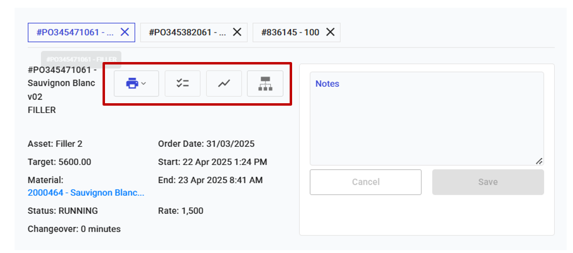 4. **Orders**, shows target and completed units for the current order. Selecting this will display a list of Orders for this Asset.