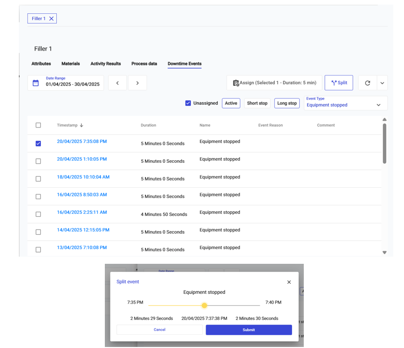 * **Downtime Events** - which shows a downtime event associated with the asset. You can filter them by Active, Short or Long Stop, Event Type, or as well as if they are assigned. You can also split these events,