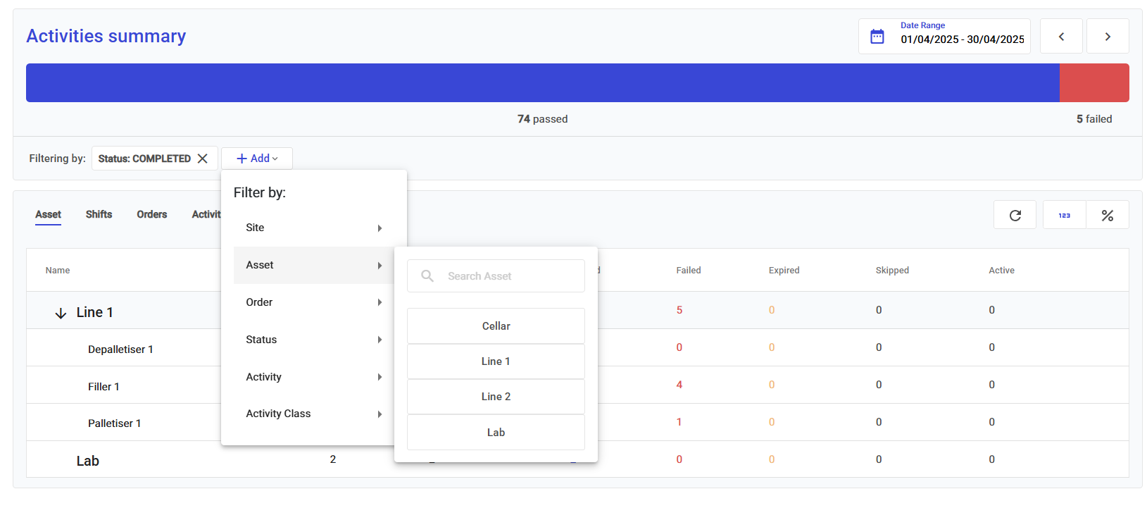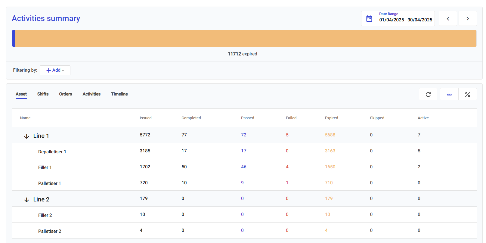 The report table is designed for easy navigation. Start by selecting an **Asset**, then drill down into **Orders** and finally **Activities** that occurred within your selected date range.