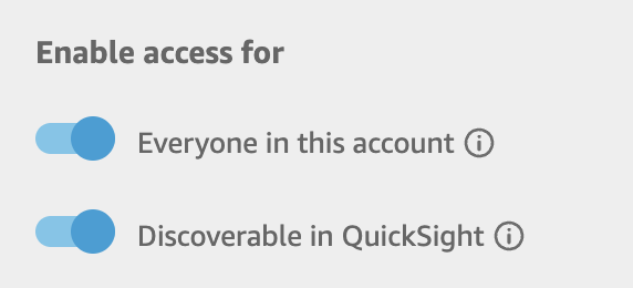 In the bottom left hand corner, toggle on Everyone in this account, which will make the second toggle appear. Then toggle on Discoverable in QuickSight. This will grant all Advanced Analytics users Viewer permissions to the dashboard.