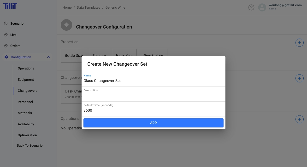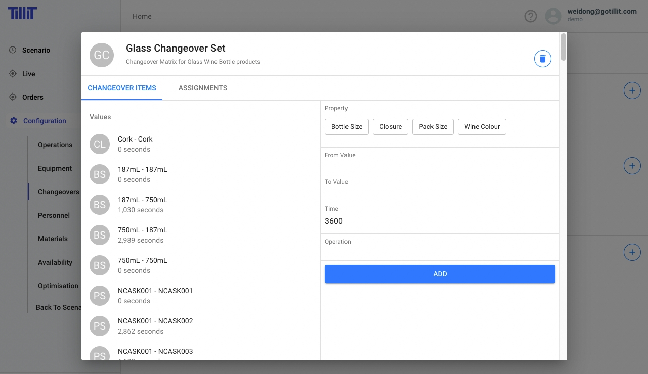 In the example above, the Changeover Set for Glass is assigned to both Wine Bottle Packaging Lines as they use the same changeover times for both lines.