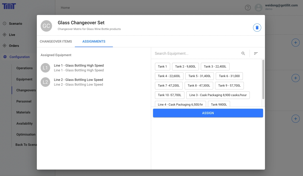 4. The last step is to assign a Changeover Set to an Equipment. You can apply different changeover sets to different equipment depending on the requirements for each situation.