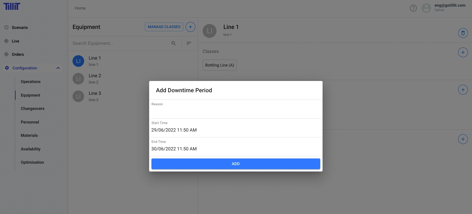 Equipment will also likely have Planned Maintenance or Downtimes associated that need to be created to ensure the system does not Schedule Production on that resource while it is out of action. To add a Downtime or Planned Maintenance Event, add a date and time for the outage period: