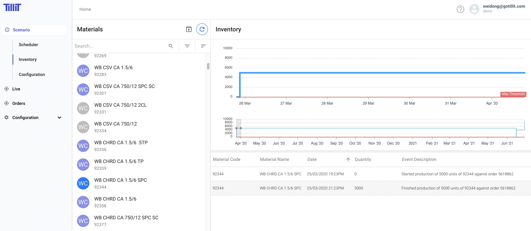 Inventory for each Material Type is visible in the Inventory Draw Down Graph which shows a forward projection of the material impact of inbound and consumed inventory: