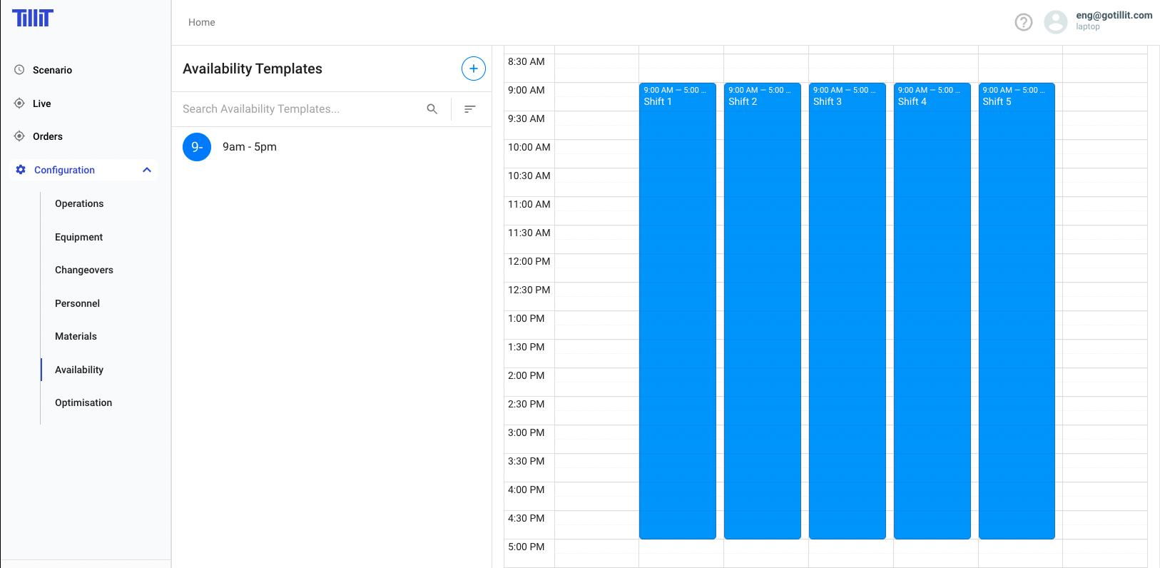 Availability is the model of time in structured ways that can be applied to resources such as personnel and equipment. Usually represented as Shifts, any number of Availability templates can be created and stored as a library for ease of assignment to a resource.
