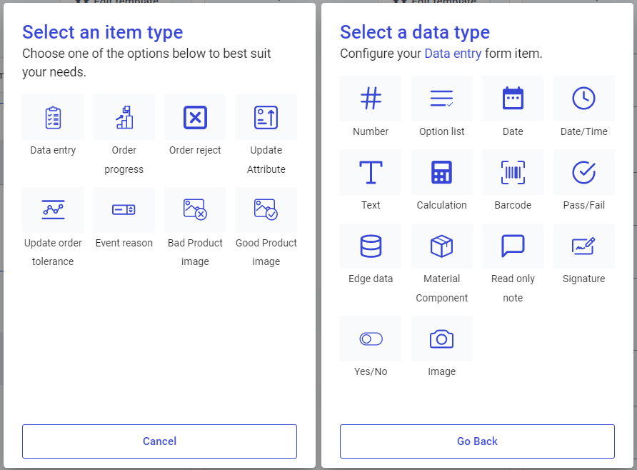 Next, click on *Add an element*. You will be asked to select an *item type*, followed by a *data type*: