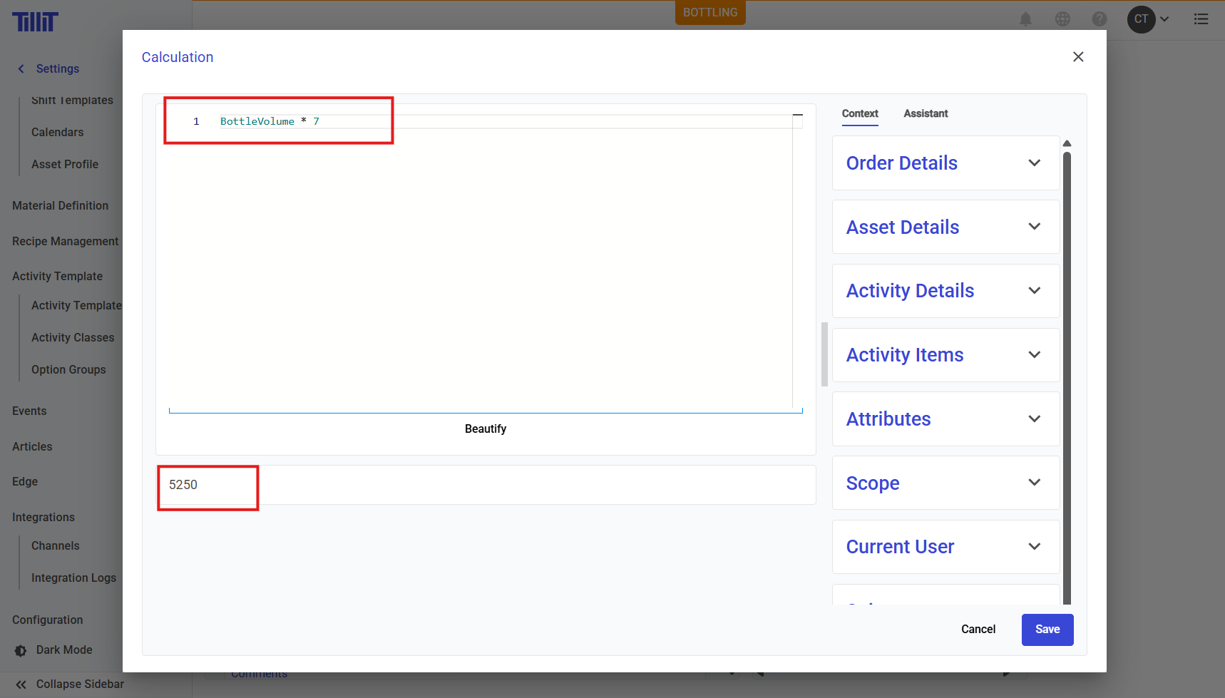 In the first screenshot, below, the attribute 'Bottle Volume' will be multiplied by 6. In this example, the value of Bottle Volume is 750, and then we are multiplying it by 7