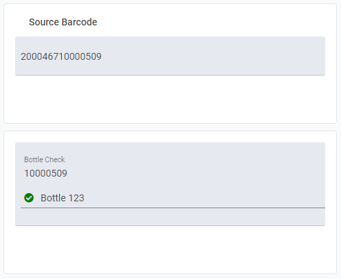 In the following example, we have created a Material Component element called "Bottle Check". We will scan the barcode from the pallet. This will parse the part of the barcode that contains the External ID of the bottle to the Material Component.