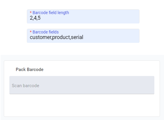 Accepts any character (text, number, spaces and special characters). Define barcode field lengths to parse into other elements in the activity.