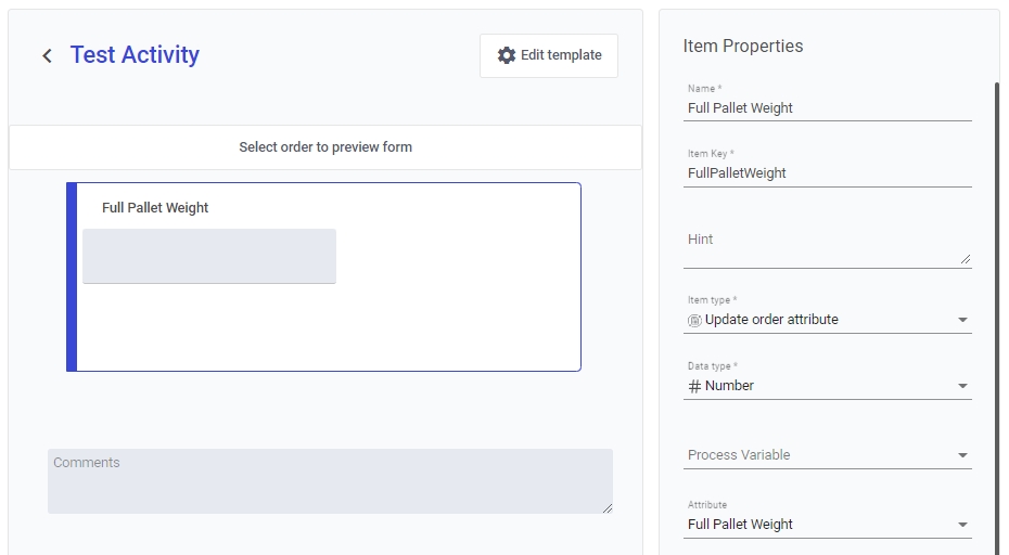 Update Order Attribute does not require a value to be present before setting one. For example, we need to record the full pallet weight to reference later. We have configured an attribute called Full Pallet Weight. Howvere, in the list of this order's attributes, you can see that it it not yet present: