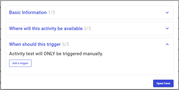 If left blank, the activity won't trigger with any event, but can be triggered manually. Even when a trigger is assigned, you can still trigger an activity manually,