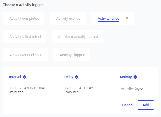If you don't set an activity key, then the trigger will apply to all activities. For example, you may want to trigger an activity called Team Lead Intervention when any activity fails a retest.