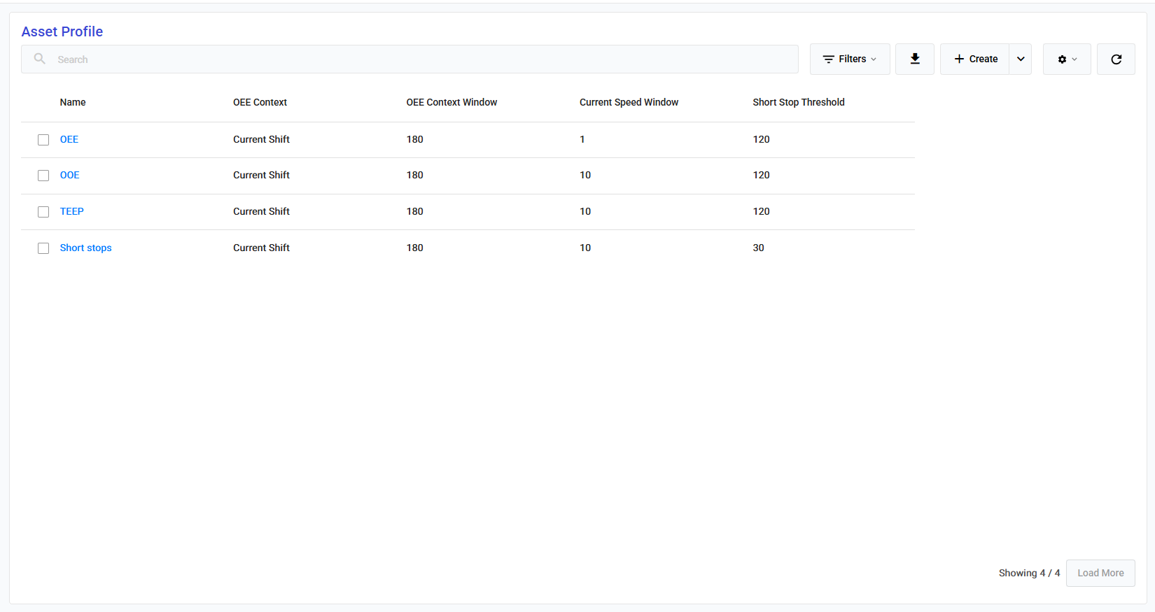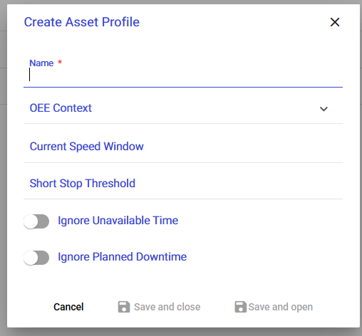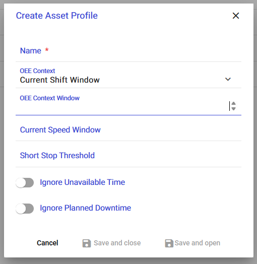 <table><thead><tr><th>Field</th><th width="491">Description</th><th>Uom</th></tr></thead><tbody><tr><td>Name</td><td>Name of the Asset Profile</td><td></td></tr><tr><td>OEE Context</td><td>What to use to calculate stats for an asset</td><td></td></tr><tr><td>OEE Context Window</td><td><ul><li><strong>Current Shift</strong> - Asset OEE calculated from start of current shift ← This represents current and default behavior</li><li><strong>Current Shift Window</strong> - Asset OEE calculated from start of current shift BUT only for the last x minutes.</li><li><strong>Current Order</strong> - Asset OEE calculated from start of current order</li><li><strong>Current Shift Window</strong> - Asset OEE calculated from start of current shift BUT only for the last x minutes.</li><li><strong>Asset Window</strong> - Asset OEE calculated for for the last x minutes.</li><li><strong>Today</strong> - Asset OEE calculated from the start of the day to now.</li></ul><p><br>If your OEE context contains "Window", then you can set the context window duration.<br><img src="https://352909507-files.gitbook.io/~/files/v0/b/gitbook-x-prod.appspot.com/o/spaces%2FrNT40XJFAFlAhUX8CcQS%2Fuploads%2Fgit-blob-0ecdbafc889049f6e1ac7cf7fc55556981d9fccc%2Fimage.png?alt=media" alt=""></p></td><td>Minutes</td></tr><tr><td>Current Speed Window</td><td>How often you want the speed of production to be calculated. Default value is 10 minutes</td><td>Minutes</td></tr><tr><td>Short Stop Threshold</td><td>Threshold to categorize downtime evetns on that Asset as "Short stop" or "Long Stop".<br>See <a data-mention href="../../../everyday-usage/downtime-table">downtime-table</a></td><td>Seconds</td></tr><tr><td>Ignore Unavailable Time</td><td>When checked, will ignore any rows that have the downtime type of UNAVAILABLE.<br>This downtime type is often used whenever a shift break occurs and we want to ignore the downtime which was caused by that.</td><td></td></tr><tr><td>Ignore Planned Downtime</td><td>When checked, do not count planned down time's as "penalties" when calculating availability</td><td></td></tr><tr><td>Enable Shift Handover AI</td><td>When checked, assets with this asset profile assigned will get a message in the asset chat during shift handover. This message will contain insights from the previous shifts.<br>See more below <a data-mention href="#heads-up-ai-assistant-insights">#heads-up-ai-assistant-insights</a></td><td></td></tr><tr><td>Enable Order Ready AI</td><td>When checked, assets with this asset profile assigned will get a message in the asset chat after you have ready an order. This message will contain insights from the orders of the same materials.<br>See more below <a data-mention href="#heads-up-ai-assistant-insights">#heads-up-ai-assistant-insights</a></td><td></td></tr></tbody></table>