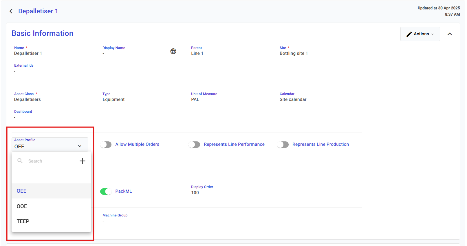 The **Asset Profile** setting defines how speed is calculated for OEE, depending on how the machine operates.