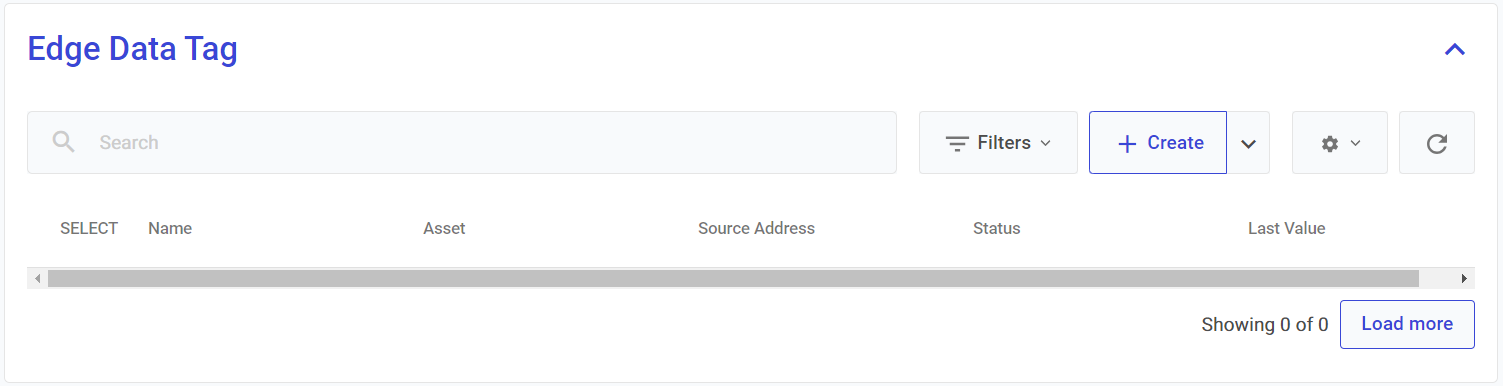 Then **select the relevant Asset.** On the asset details page find the **Edge Data Tag** panel and click to open. Click **Create**.