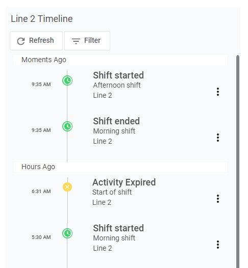 Upon creating a shift, see that a Shift started event has occured on the asset. If a previous shift was running, then a Shift ended event also appears.