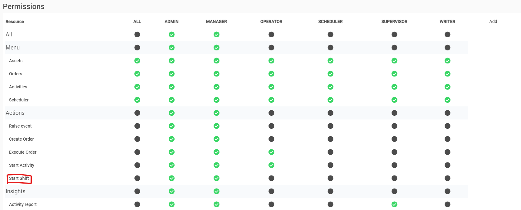 By default, anyone with full access to the actions will be able to start and stop shifts. Otherwise, this will need to be enabled in the User Permissions tab to allow the EXECUTE permission of ExecuteShift. A person without permission will not be able to open the Shift Change menu.