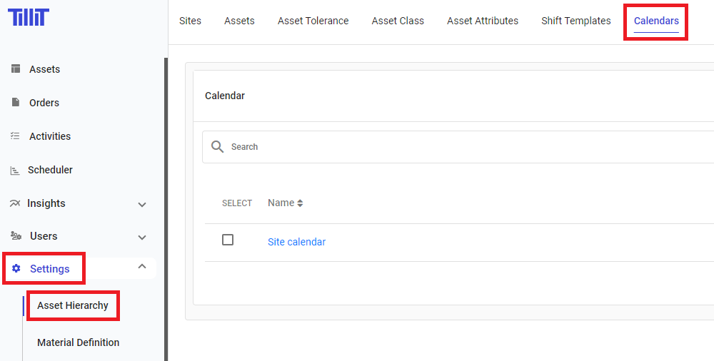 To create a Shift Template, go to Settings > Asset Hierarchy > Calendars.