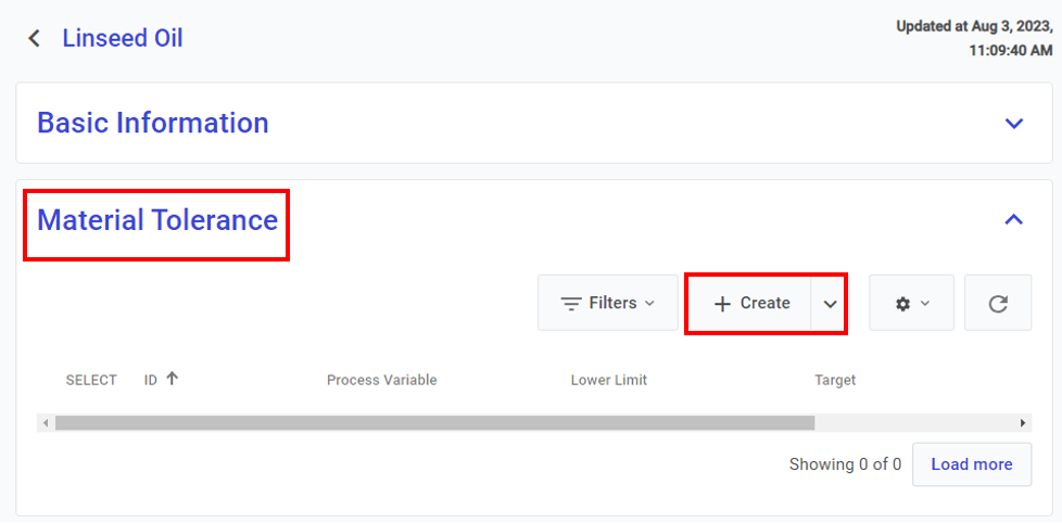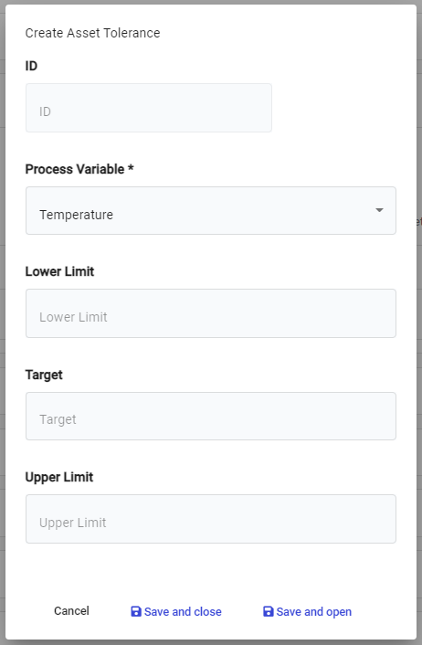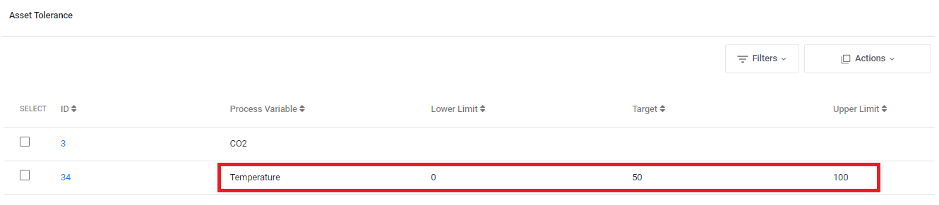 In the Asset Tolerance tab, click Actions > Create: