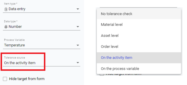 * **On the activity item** - allows you to define tolerances within the item properties of the element. A [process-variable](https://help.tillit.cloud/tillit/knowledge-base/setting-up-tillit/configuration/process-variable "mention")is required but you can fill out new constraints and limits yourself.