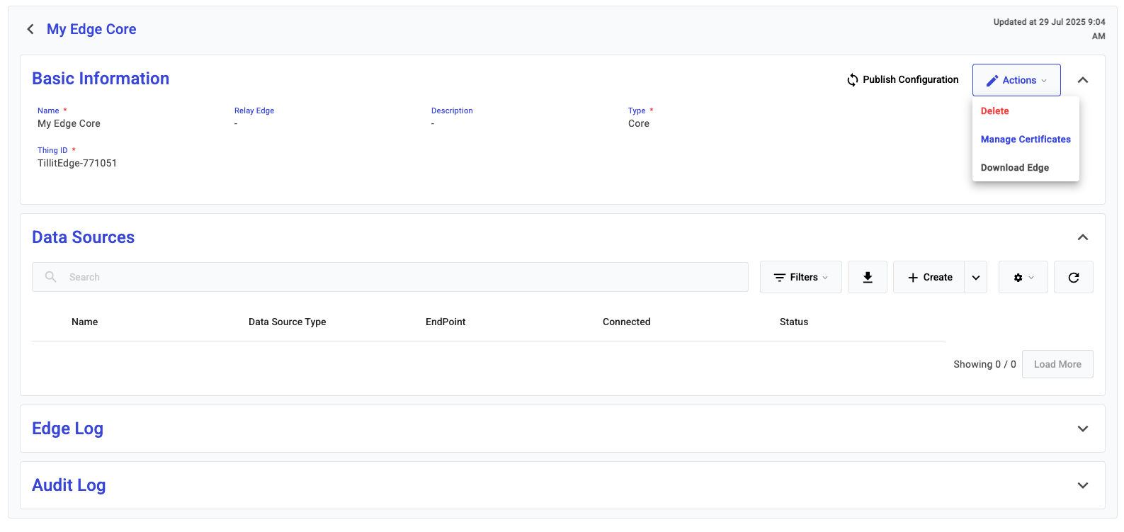 Open an edge, and navigate to the **Manage Certificates** screen by using the **Actions** button