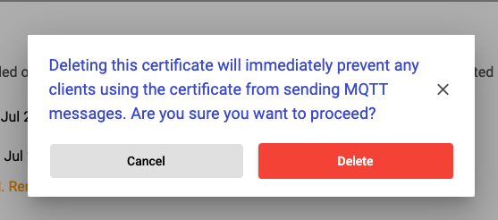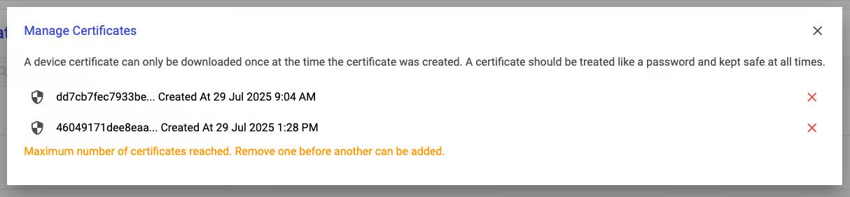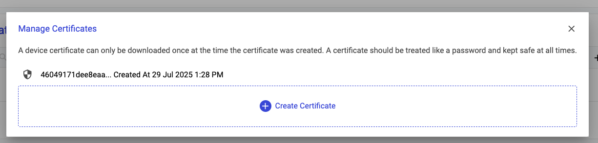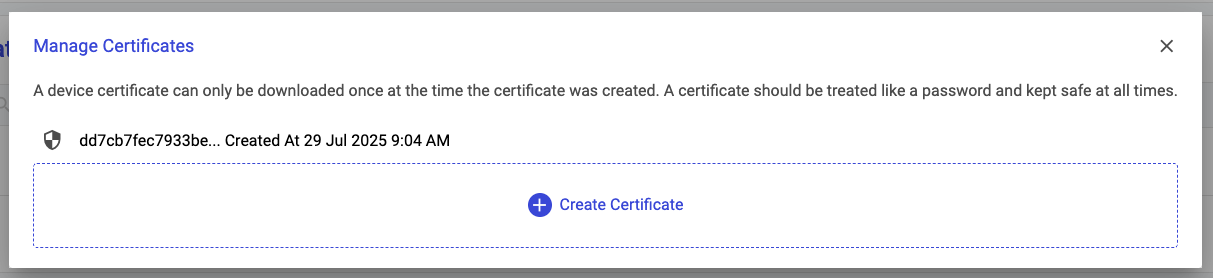A certificate/key pair is used in **MQTT mTLS** connections to the **TilliT IoT Cloud**. It's important that the keys for this connection are kept safe and secure. For this reason, all certificate/key pairs can only be downloaded once at the time of creation. If you lose your certificate, or you would like to swap out the certificates for your connection, you can use the **Manage Certificates** screen to achieve this.