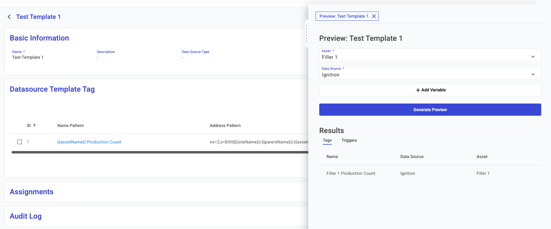 The preview page allows for an asset and datasource to preview the template on. After generating you can see the results in a tabular view. Previews do not make any modifications to the current data tags.