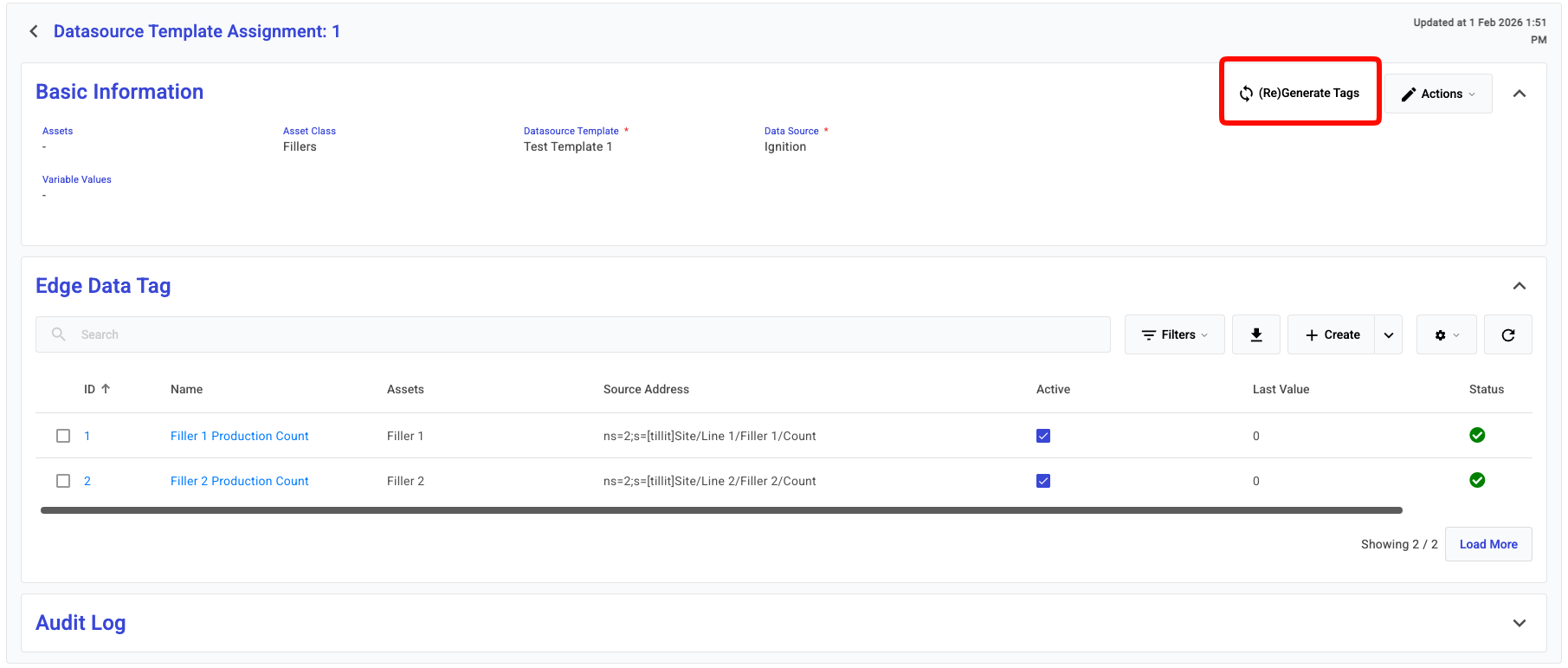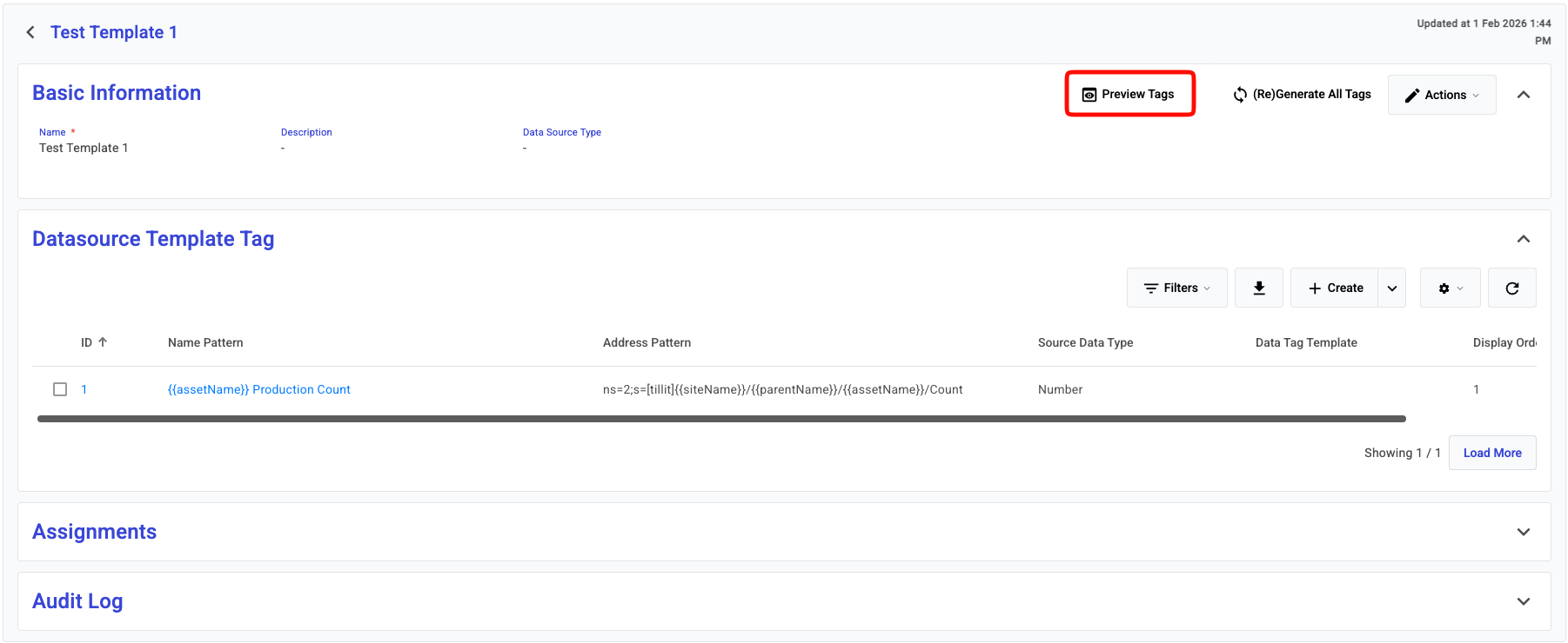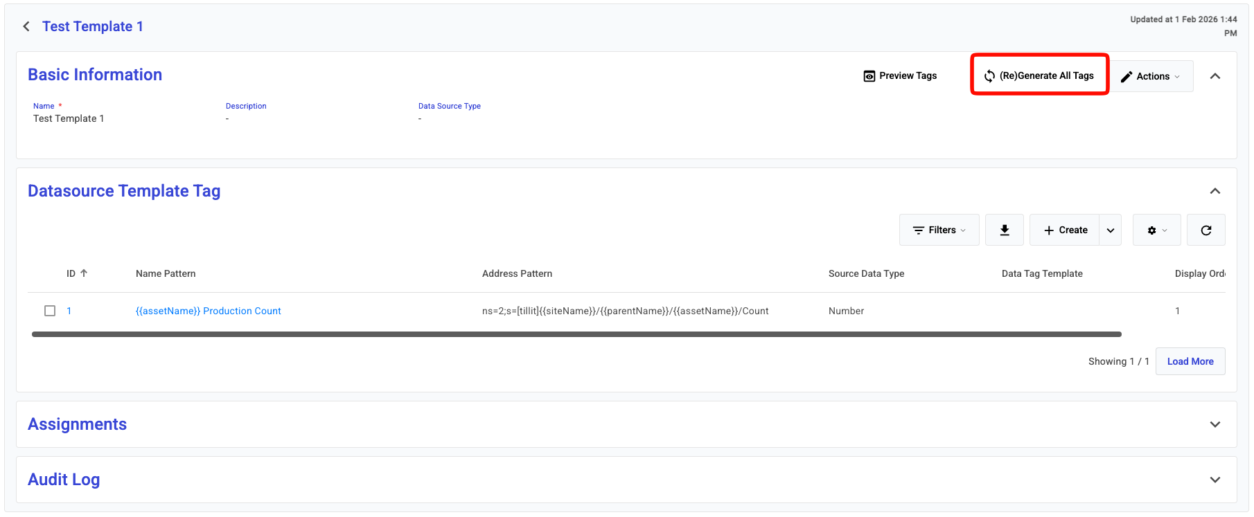 After the assignment is made, the template might get updated with a new source address path, or trigger evaluation. To apply these changes, you will need to re-generate the tags. There are two way to do this. Either you can do this per-assignment or you can re-generate for all assignment of a datasource template.